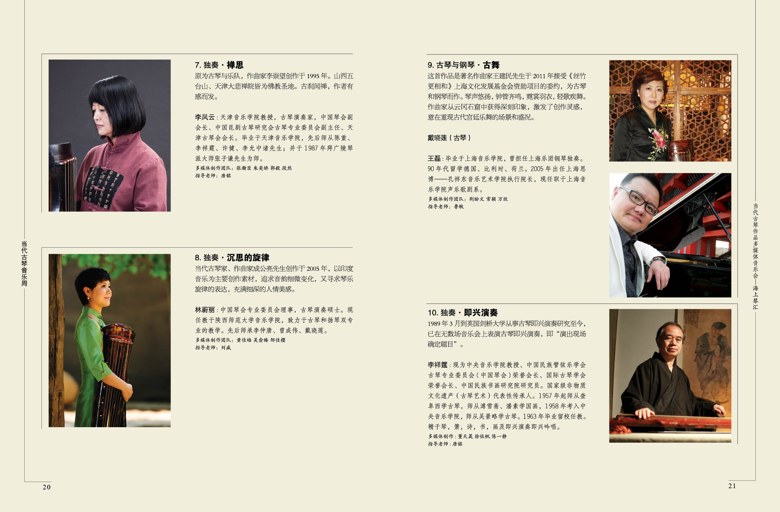 古琴重奏决赛音乐会拉开了音乐周的序幕。十首入围的古琴重奏作品在上海贺绿汀音乐厅进行了首次公开演出,由 上海音乐学院民乐系学生与作曲家排演、合作演出,评委们现场打分、颁发奖项。为更深入地反思现代琴曲的创作 理念及其当代性的内涵,戴晓莲选出过去五、六十年间,于不同时期创作的乐曲,邀请数位古琴大家参与演出了 “现代琴汇——当代古琴音乐会” 。最后,上海地区的琴家与艺术团体献上“把遗产交给未来”音乐会,主打传统 经典曲目,体现古琴艺术在传承与创新中并续。